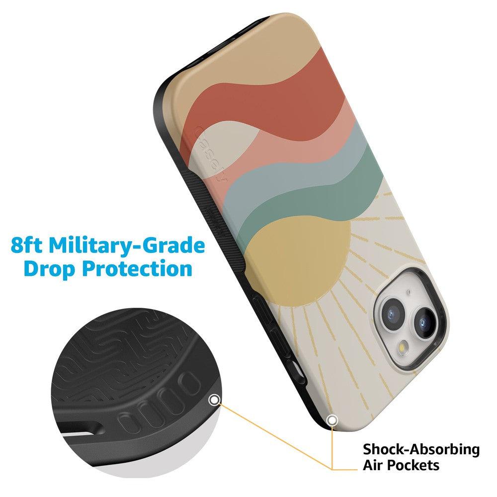 Hey little darling. what better way to wake up every morning than to the sun rising on your very own case? This shining case will add a sparkle of joy to anyone's day. making it the perfect cover to offset the gloomy fall and winter skies. It's impossible not to feel at least 2% happier after looking at the rays of sunshine beaming over rolling colorful hills! With gorgeous sunrise color combinations like yellow. blue. red. and pink. this case is as versatile as it is eye-catching. This cover is a conversation starter to return smiles to your face and your friends! This cheery cover is also perfectly able to withstand hard falls. With specifically rounded edges to protect your phone screen and volume buttons. you'll never have to worry if you're sacrificing protection for looks. This phone case can be purchased for all iPhones 6 and up. the latest Samsung models. and the latest Note models.