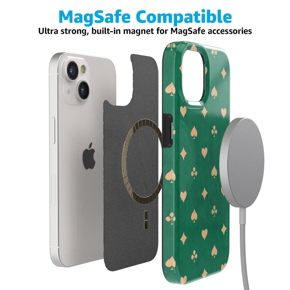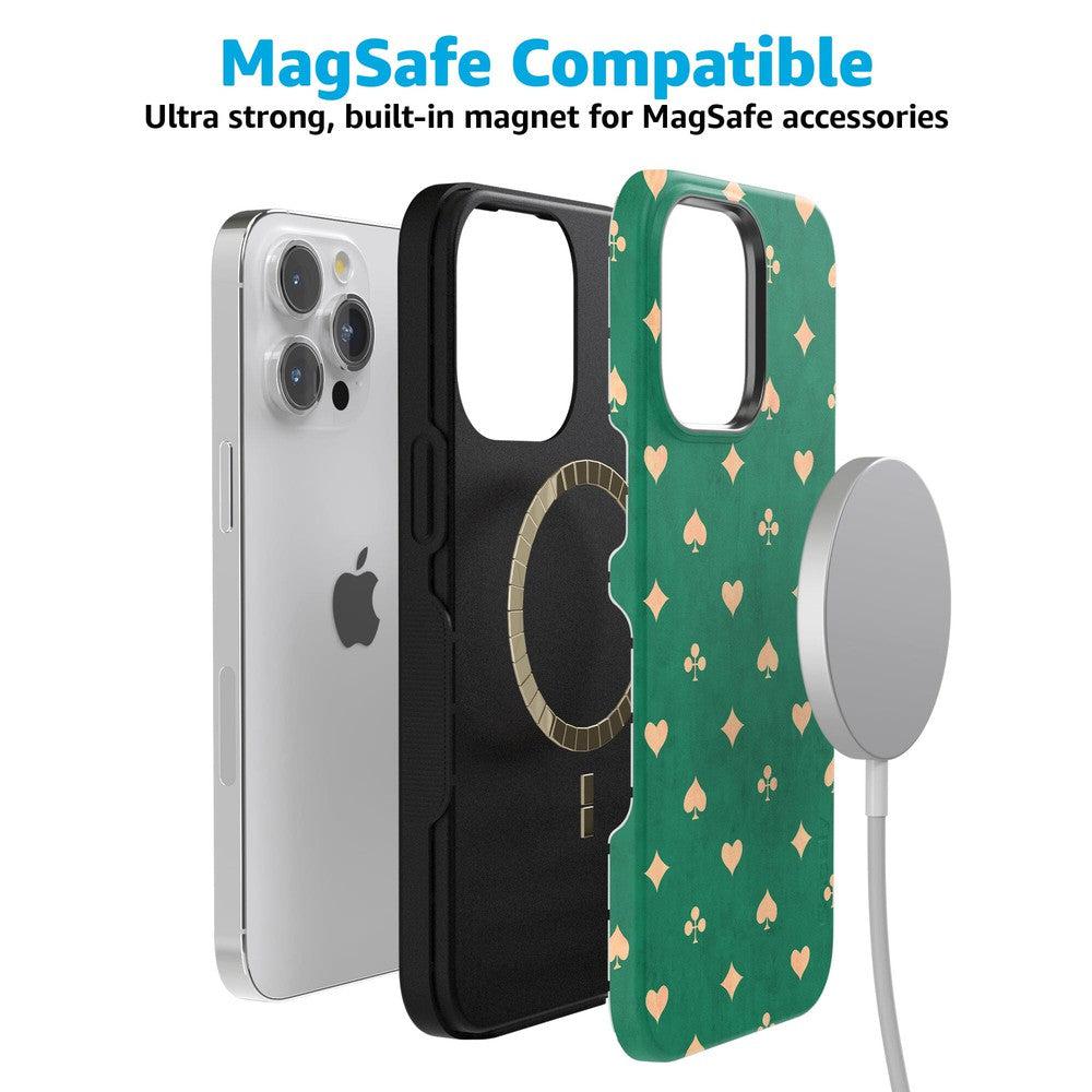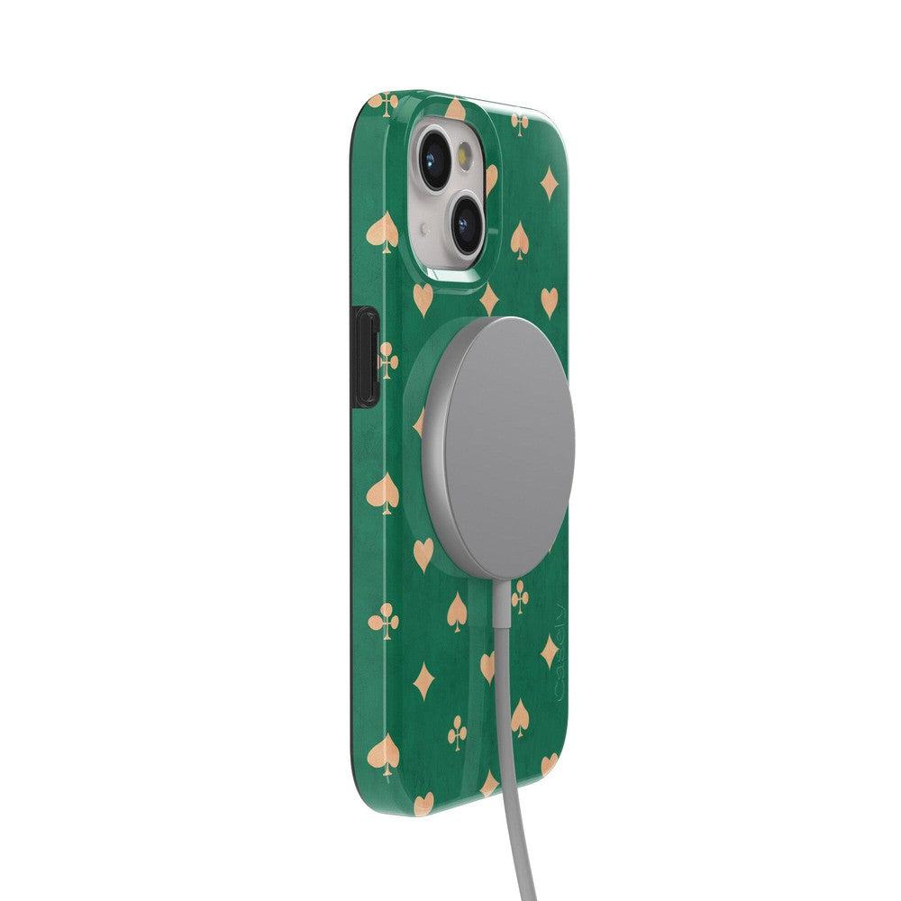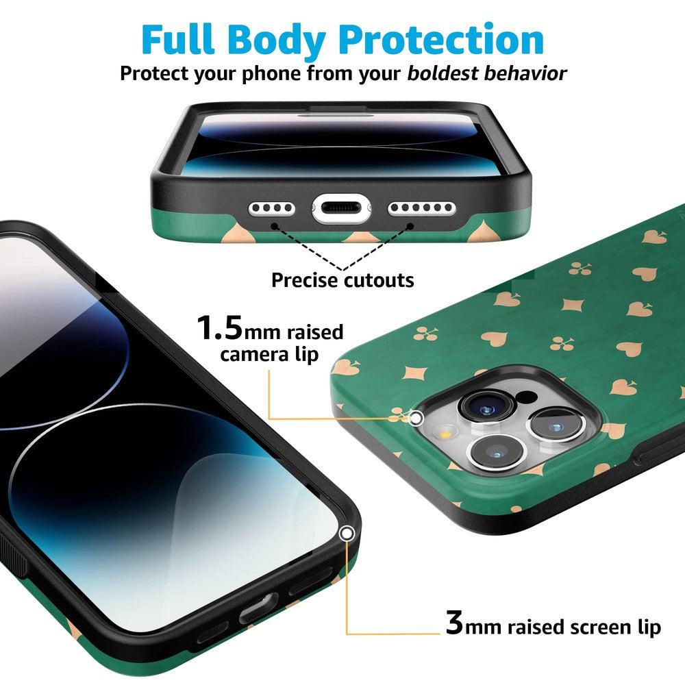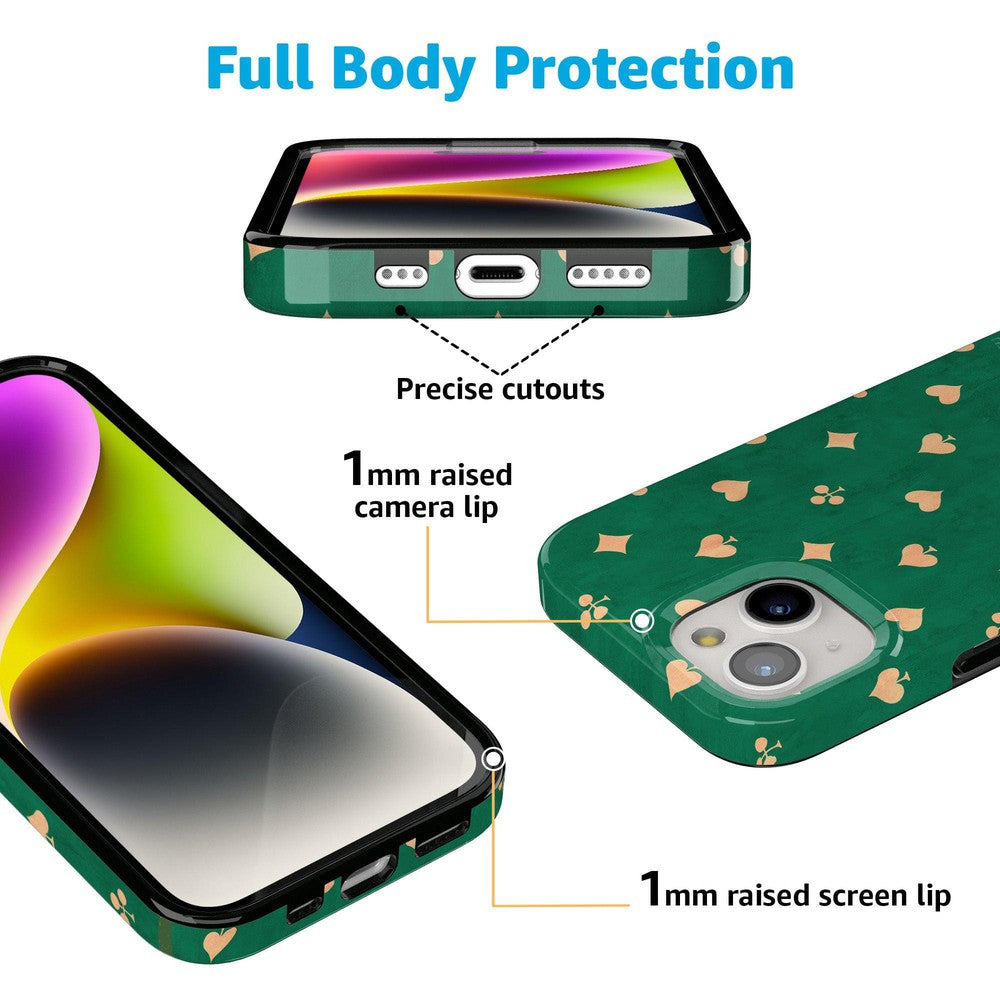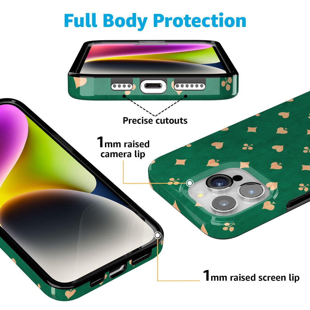 The classic playing cards-inspired pattern is given new life with this green and gold color palette. It strikes the perfect balance between chic and bold. not straying too far into either camp. It's a great way to make a statement with your phone case.