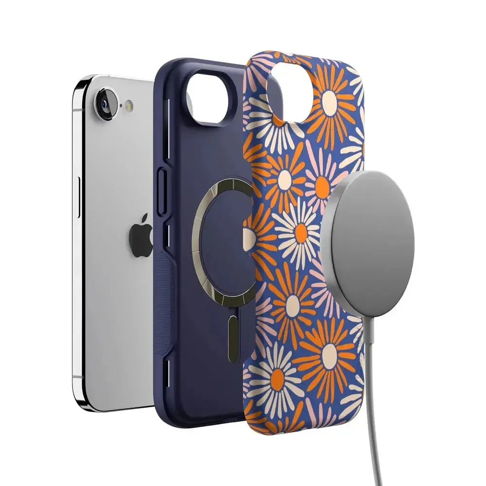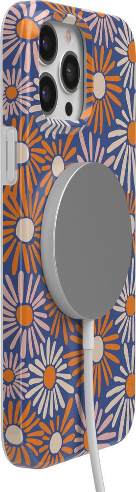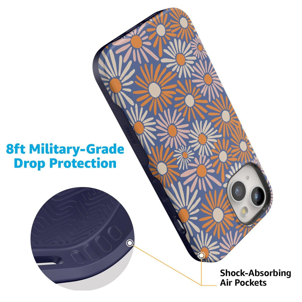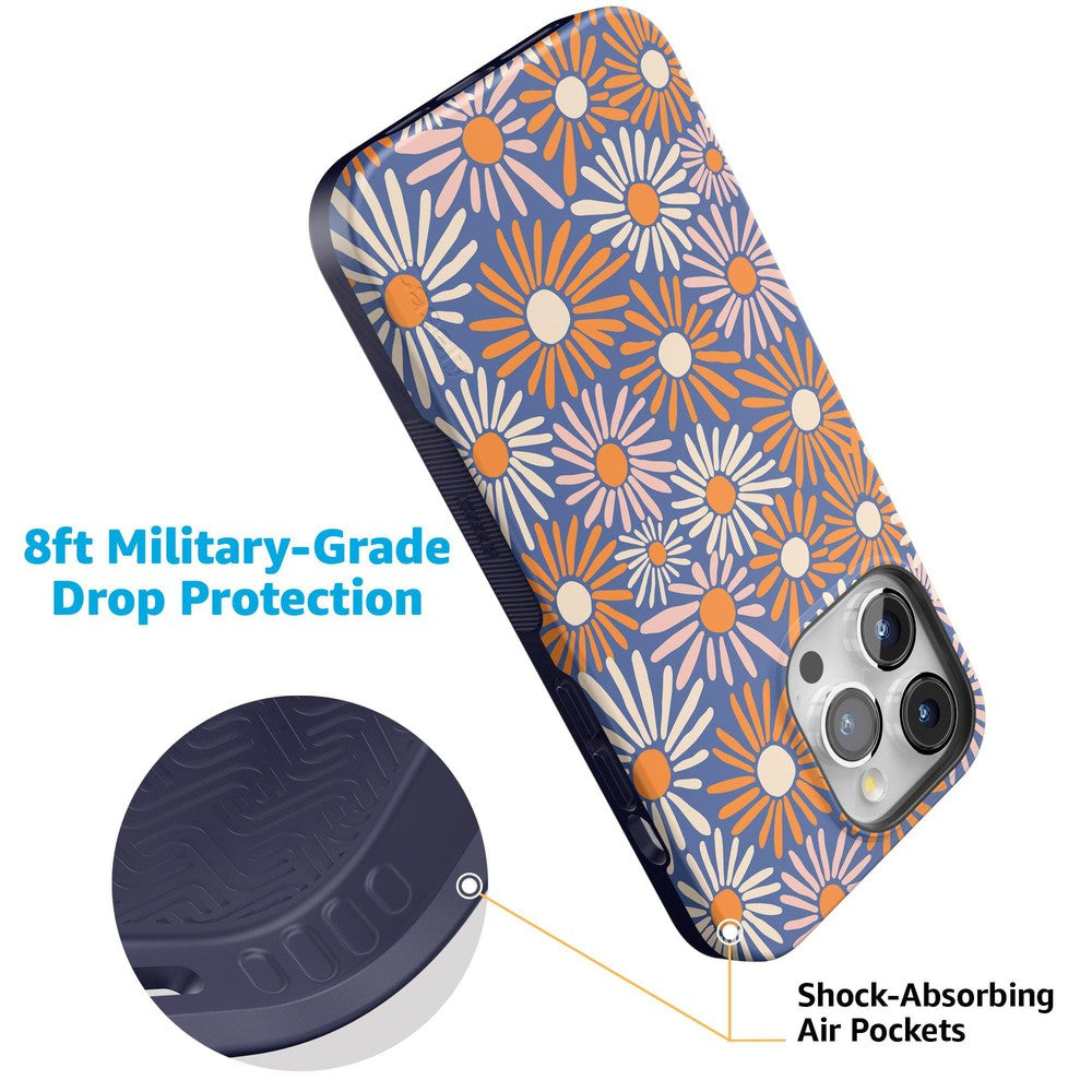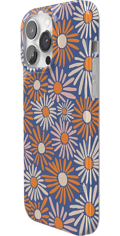 Even if you don't love daylight savings time. you'll be eager to Spring Forward with this Daisy Floral Case. Its bold flowers burst like fireworks in rich oranges and pale pinks against a deep navy background. You're looking at one bold color palette—and you're looking ready to Spring Forward into fashion. We love a good phone accessory that fits your unique personality. and this case in Daisy Floral has that perfect aesthetic of bold and contained. You'll have a fully coordinated fashion-forward outfit through all seasons.