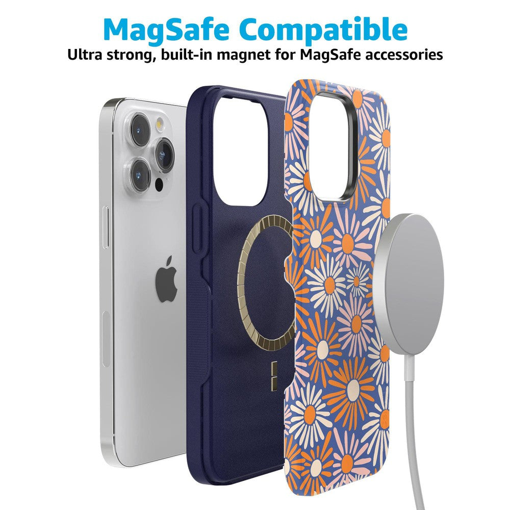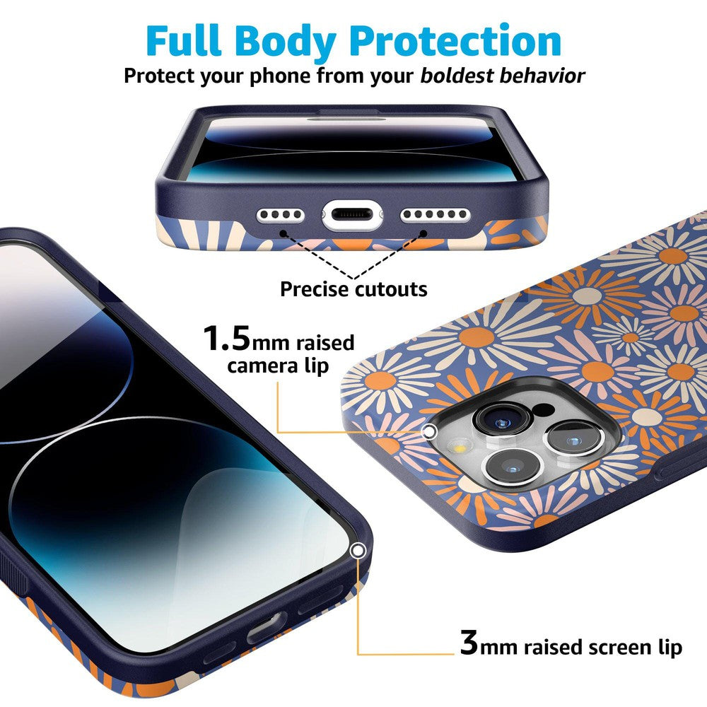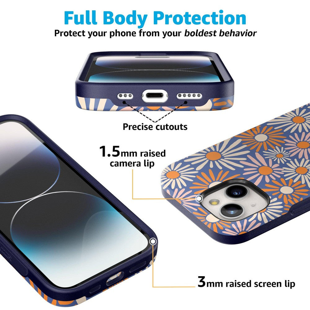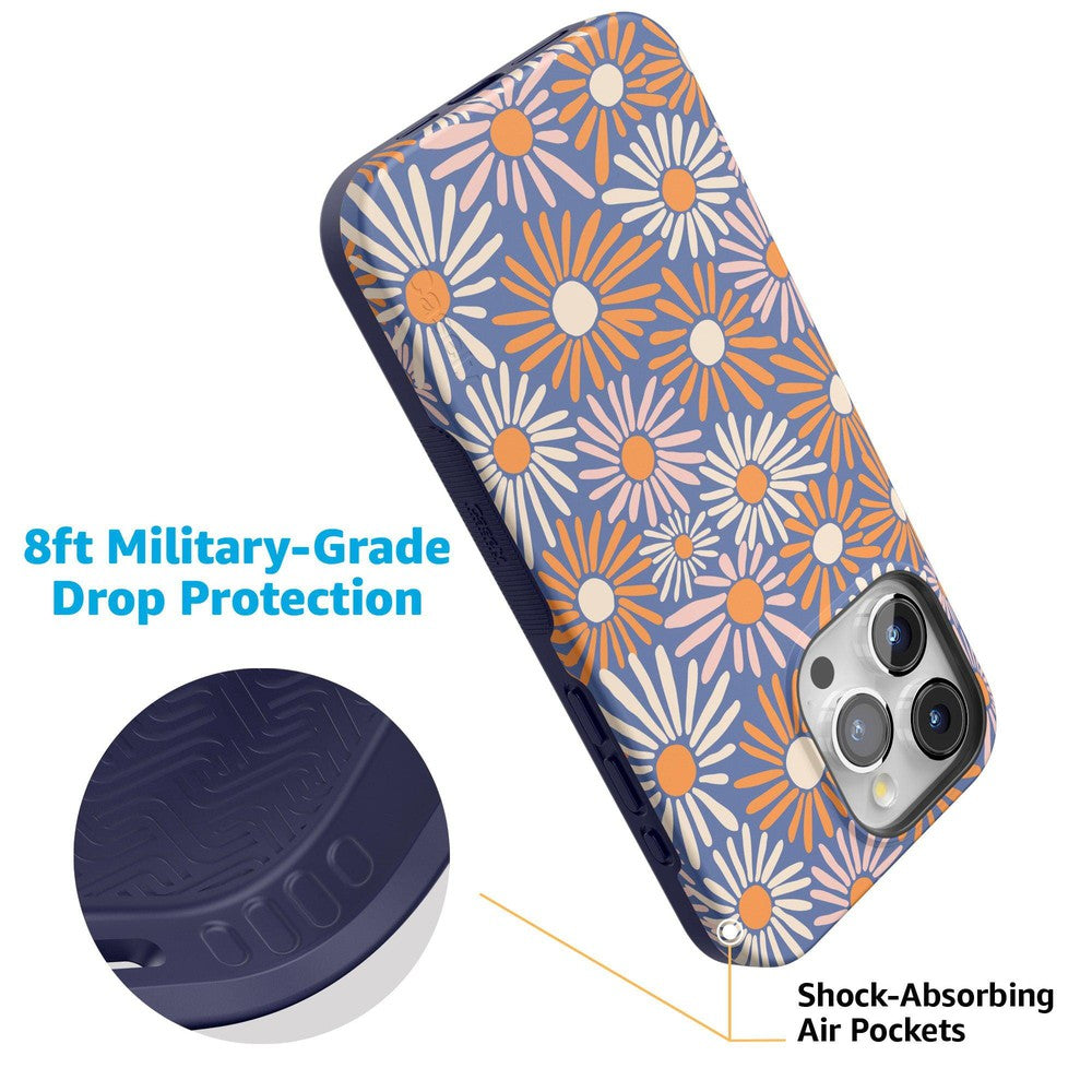 Even if you don't love daylight savings time. you'll be eager to Spring Forward with this Daisy Floral Case. Its bold flowers burst like fireworks in rich oranges and pale pinks against a deep navy background. You're looking at one bold color palette—and you're looking ready to Spring Forward into fashion. We love a good phone accessory that fits your unique personality. and this case in Daisy Floral has that perfect aesthetic of bold and contained. You'll have a fully coordinated fashion-forward outfit through all seasons.