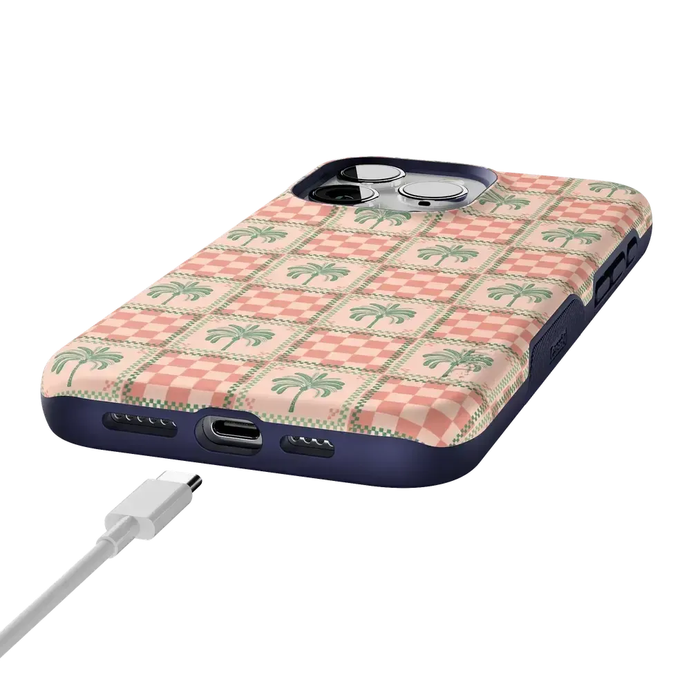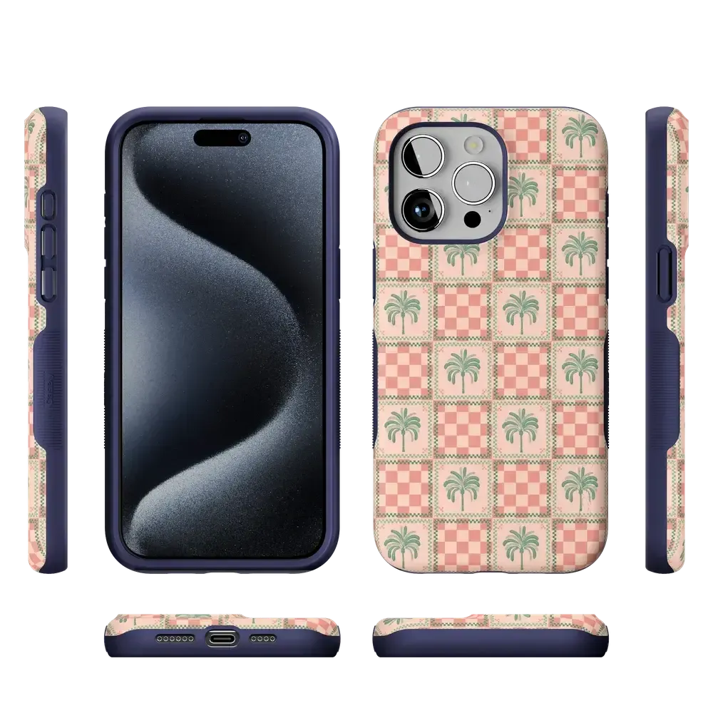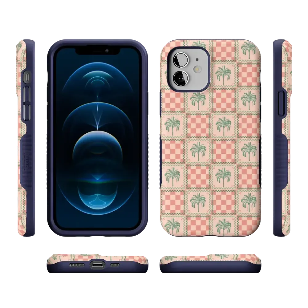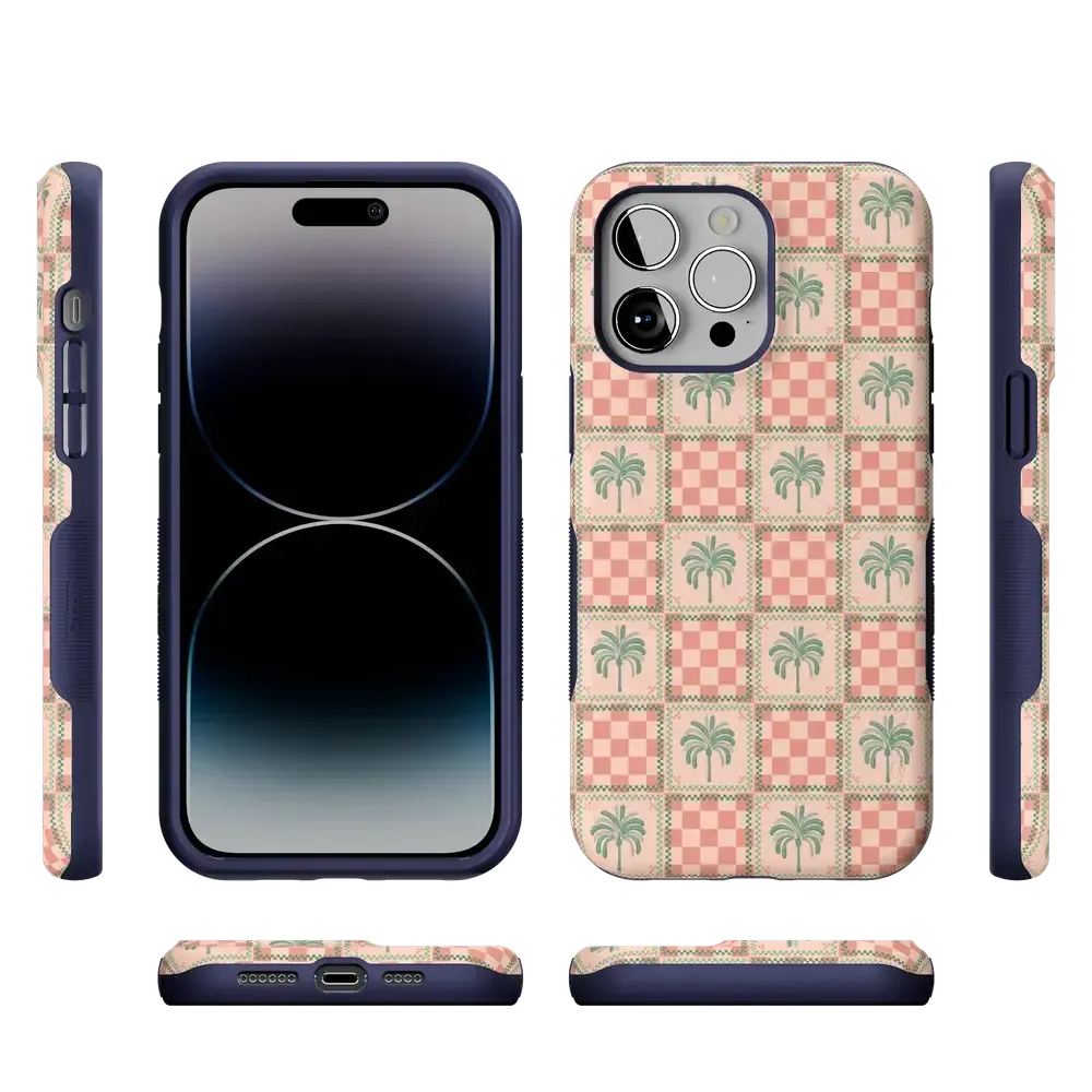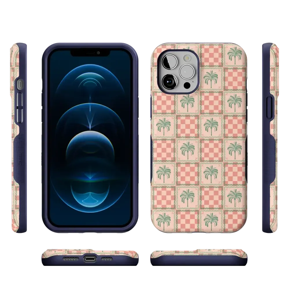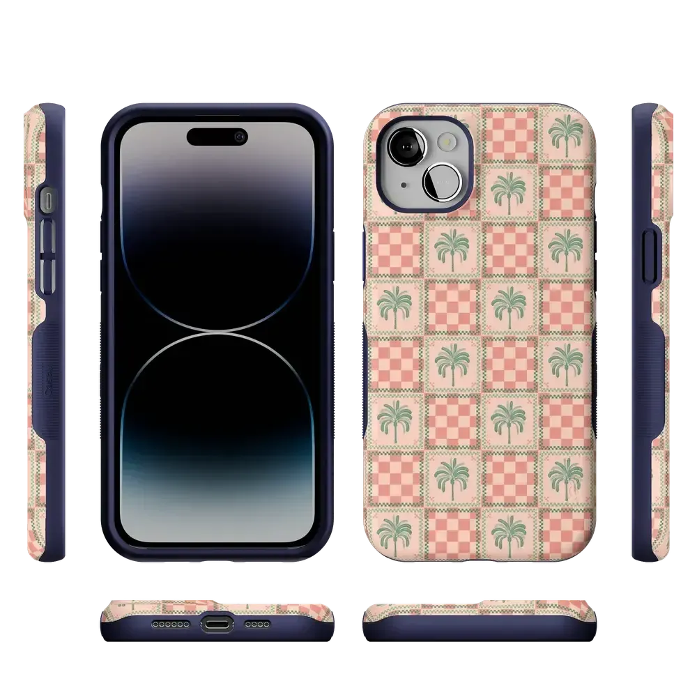 The Social Club Case is the ultimate throwback to retro resort days—think checkered pool towels. striped umbrellas. and that perfect shade of pink haze at golden hour. With a repeating grid of soft peach checks and tiny mint green palm trees. this playful design brings a nostalgic. vacation-all-the-time feel to your everyday. It's a little vintage. a little preppy. and 100% summer-ready.