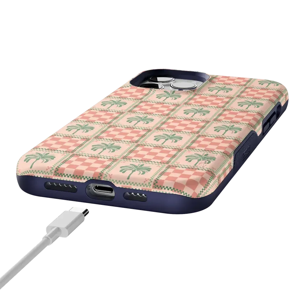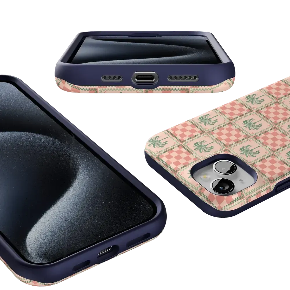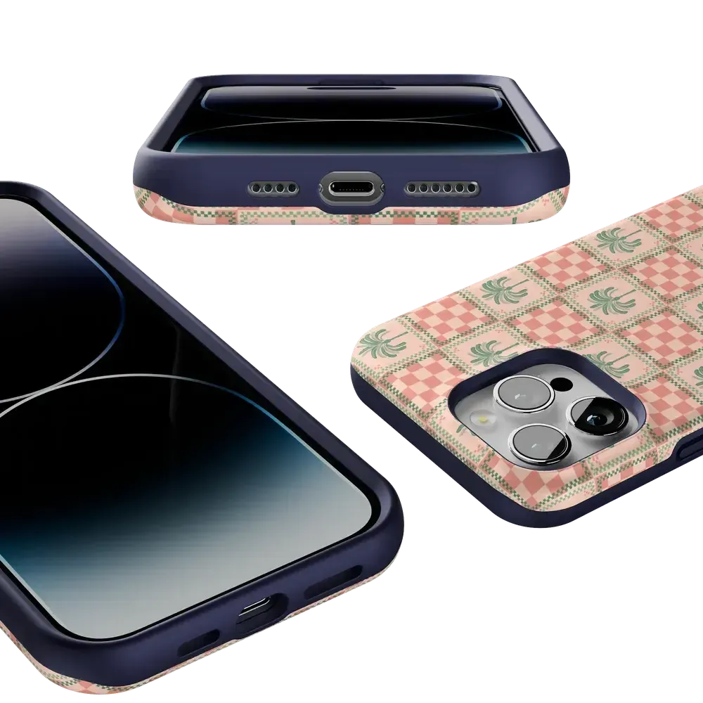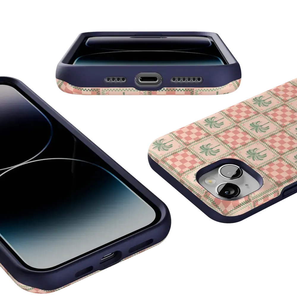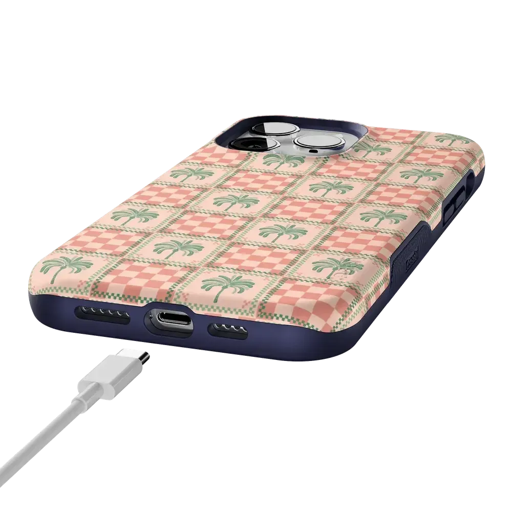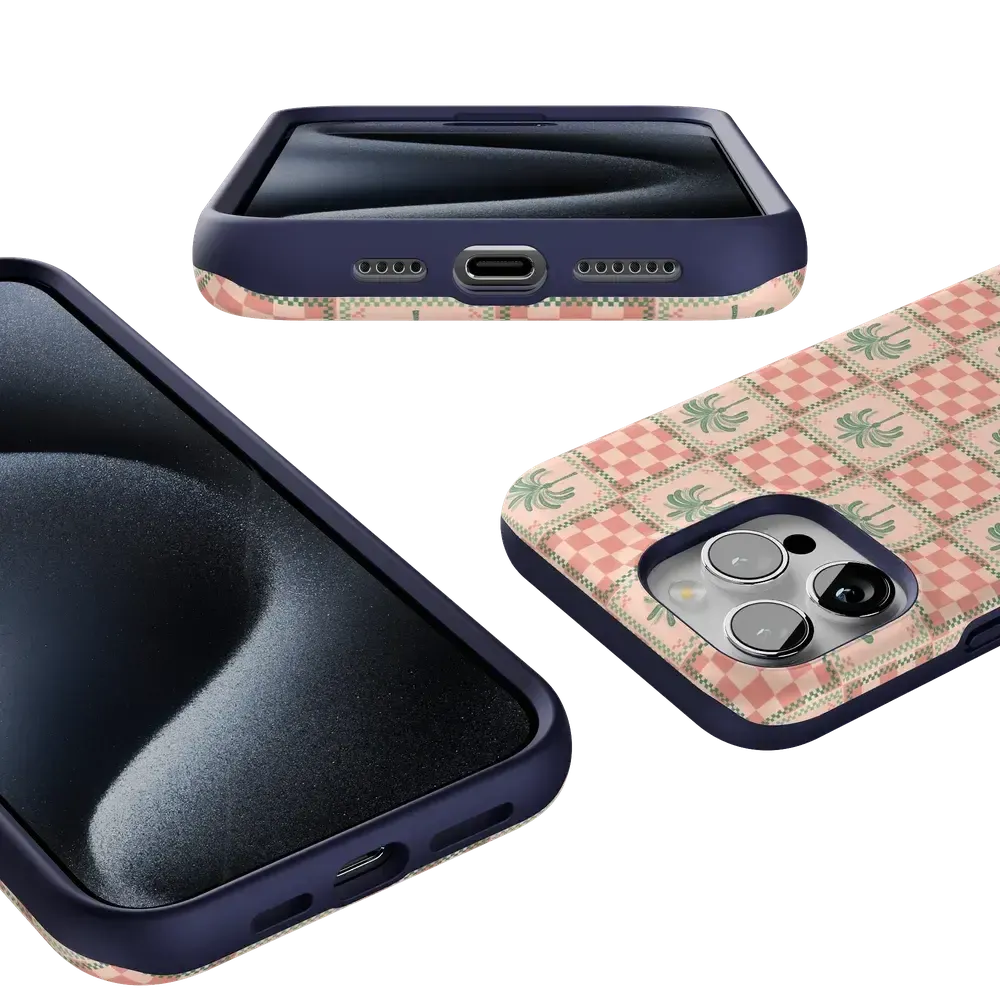 The Social Club Case is the ultimate throwback to retro resort days—think checkered pool towels. striped umbrellas. and that perfect shade of pink haze at golden hour. With a repeating grid of soft peach checks and tiny mint green palm trees. this playful design brings a nostalgic. vacation-all-the-time feel to your everyday. It's a little vintage. a little preppy. and 100% summer-ready.