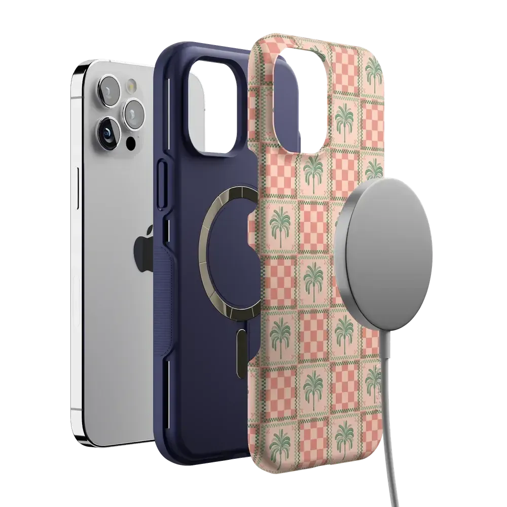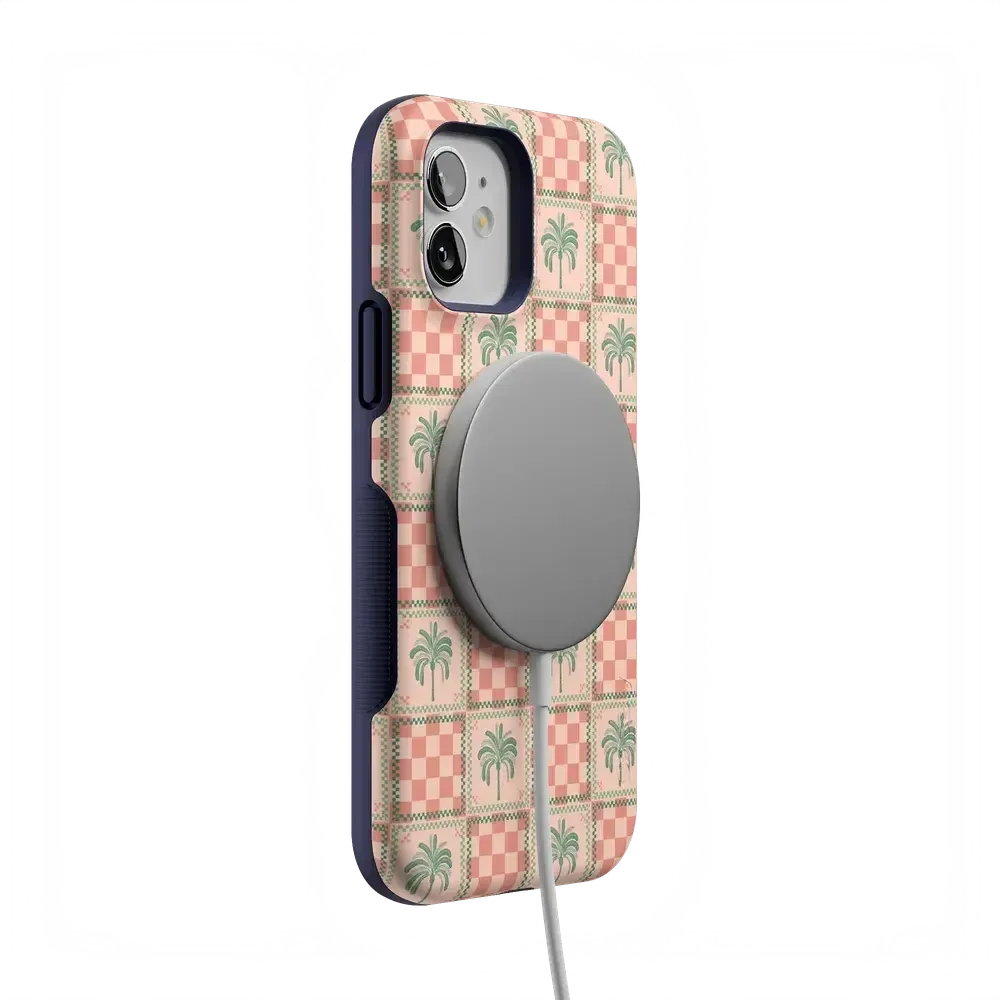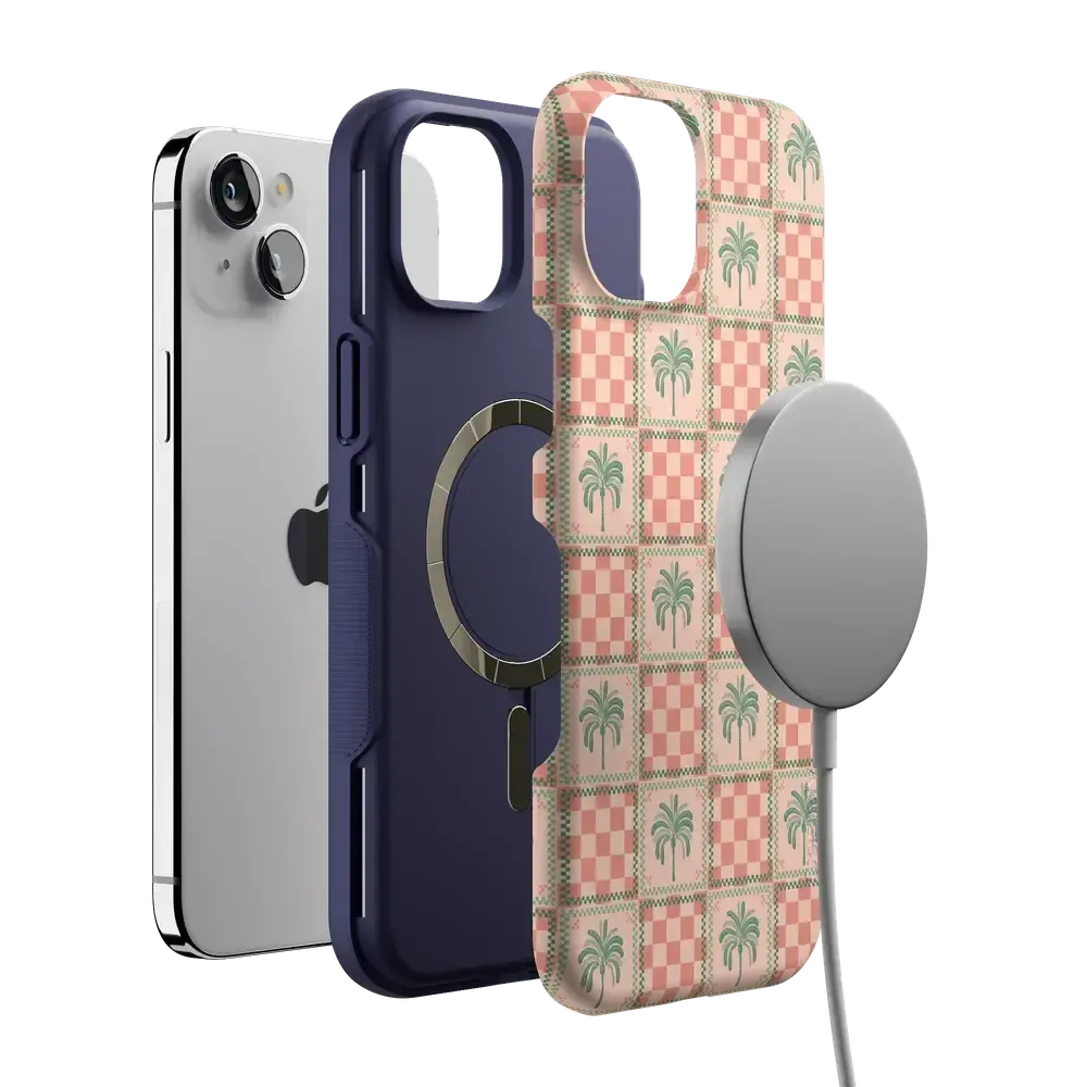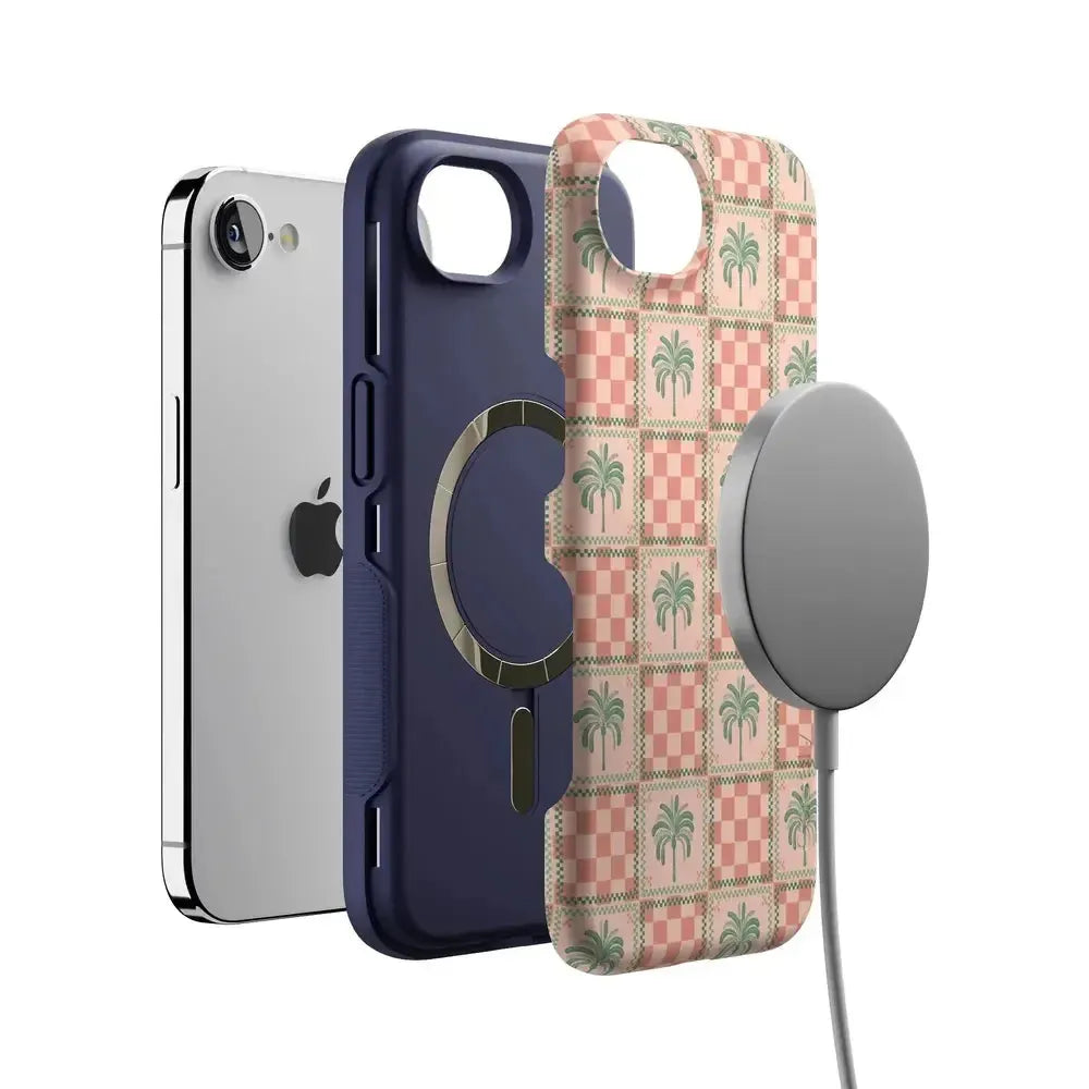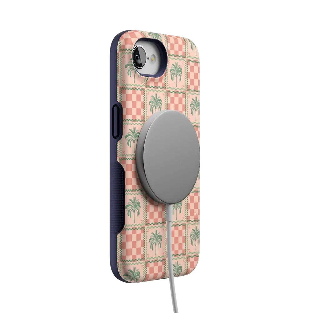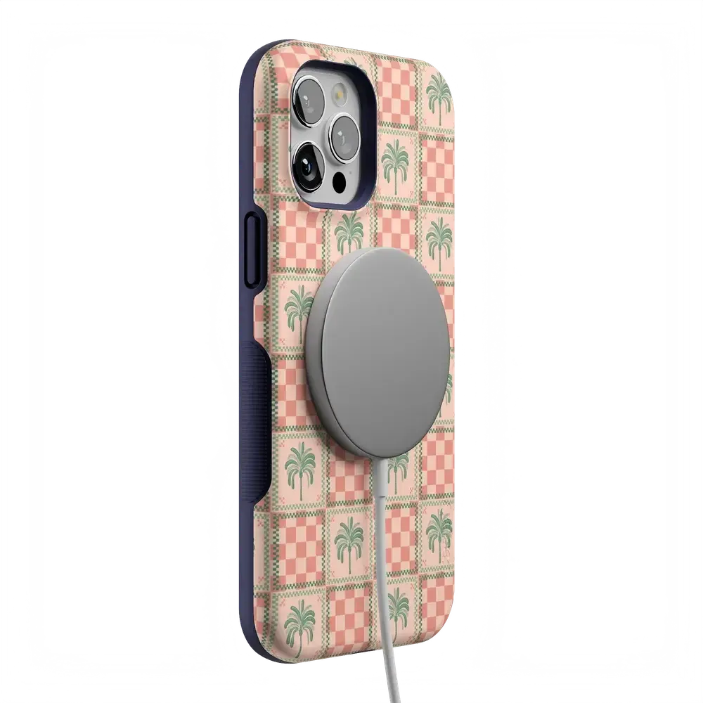 The Social Club Case is the ultimate throwback to retro resort days—think checkered pool towels. striped umbrellas. and that perfect shade of pink haze at golden hour. With a repeating grid of soft peach checks and tiny mint green palm trees. this playful design brings a nostalgic. vacation-all-the-time feel to your everyday. It's a little vintage. a little preppy. and 100% summer-ready.