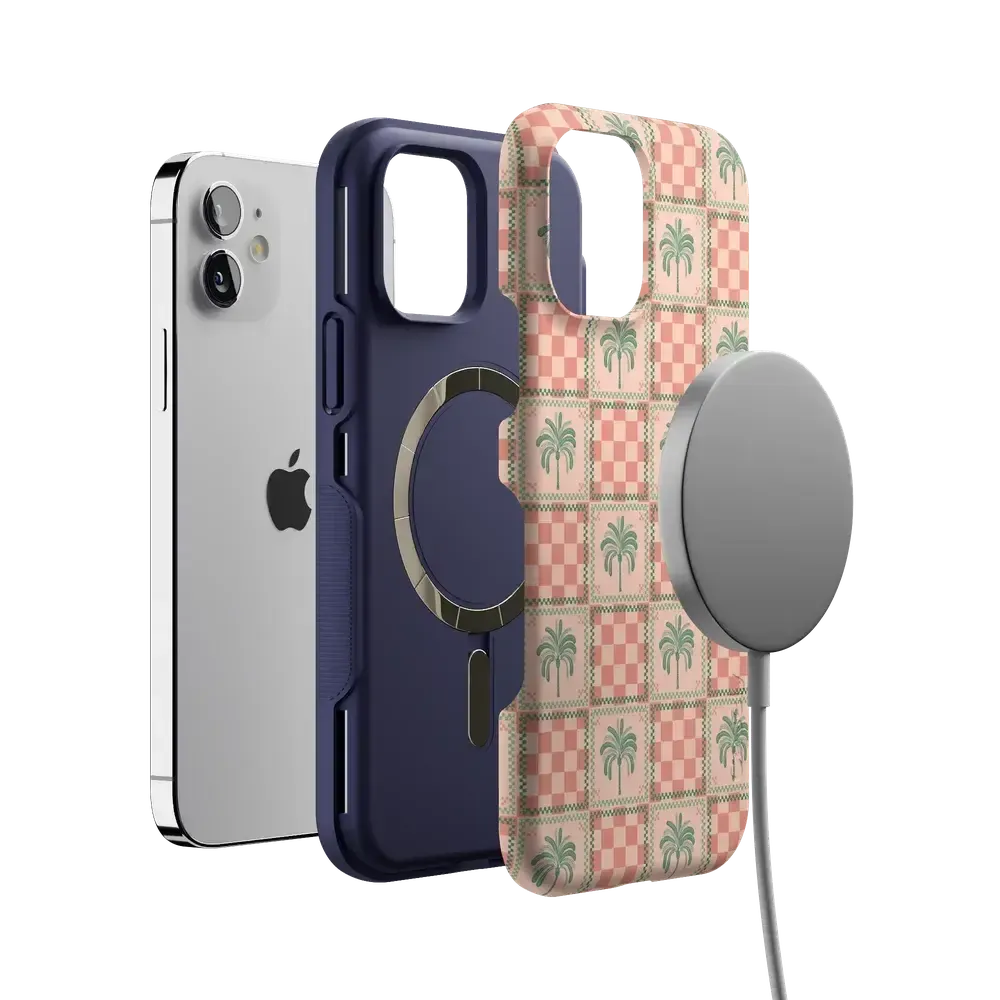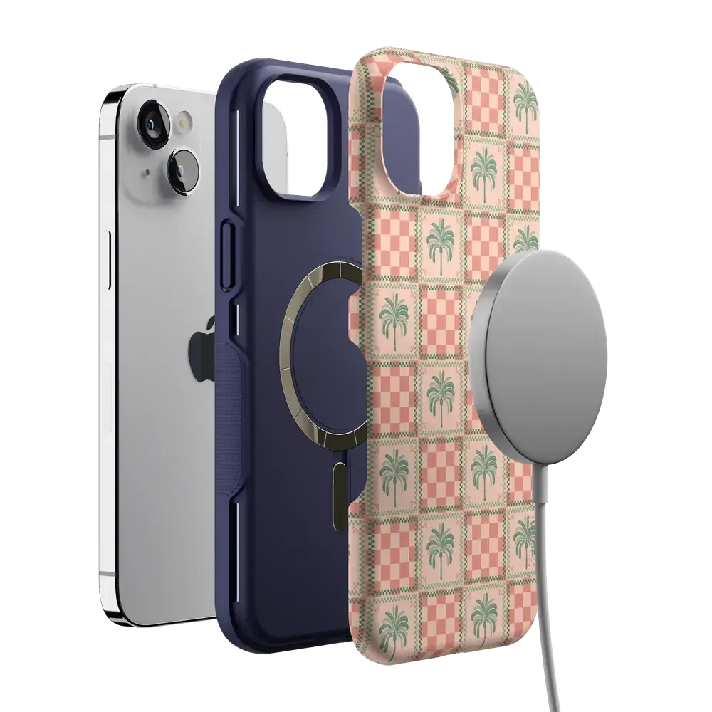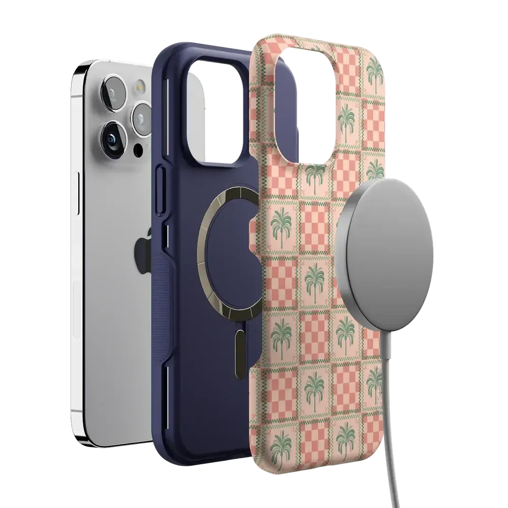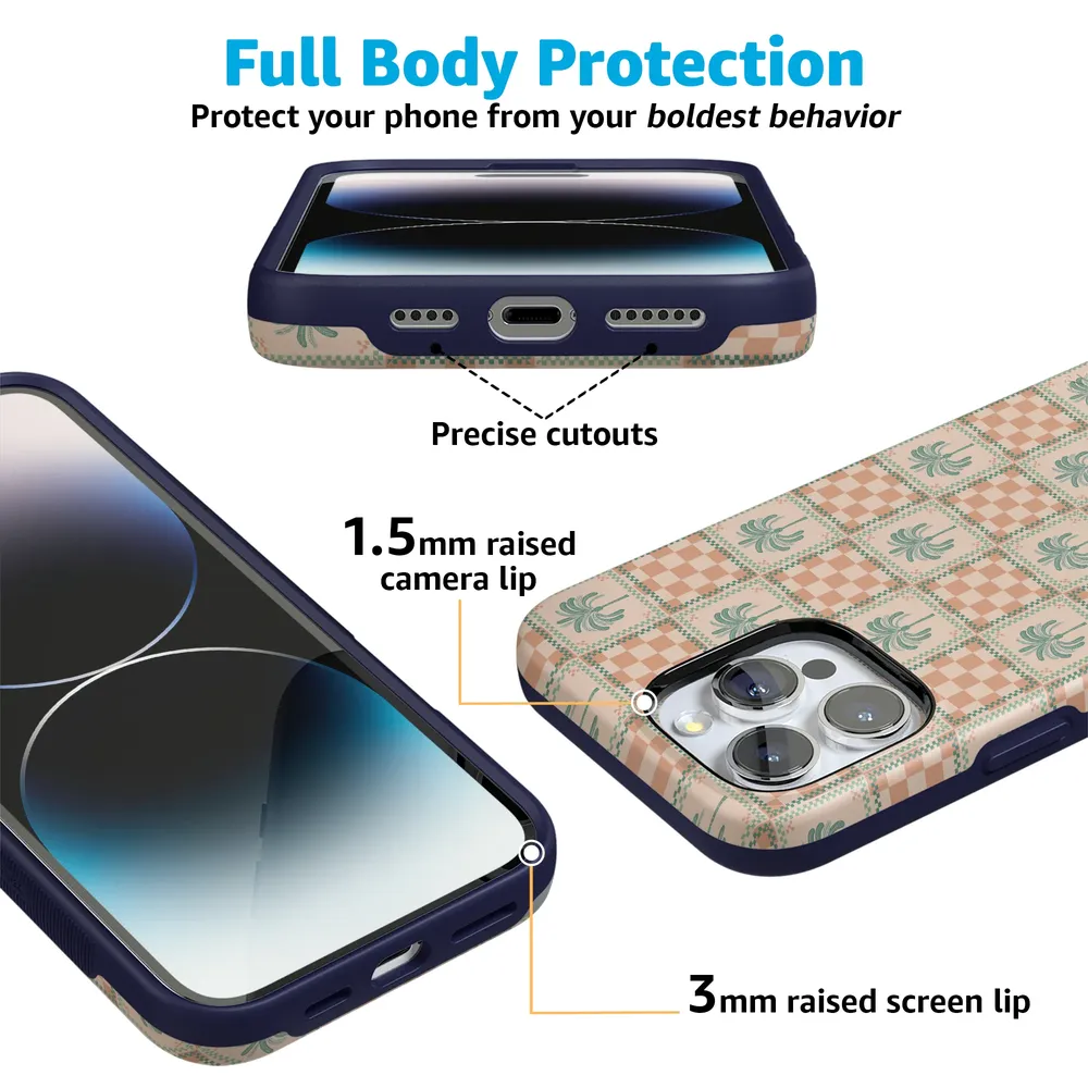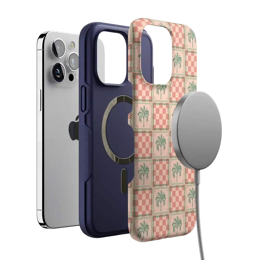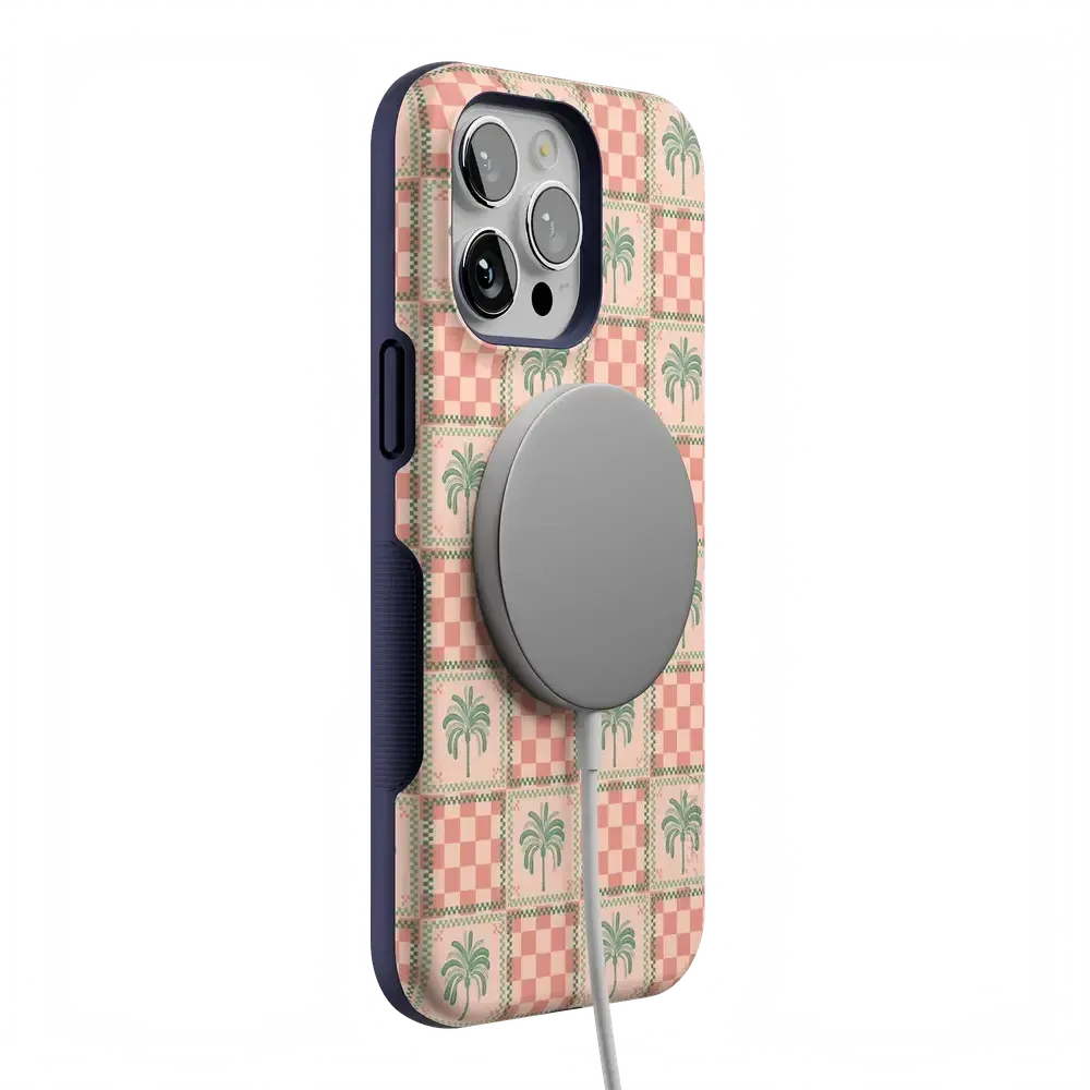 The Social Club Case is the ultimate throwback to retro resort days—think checkered pool towels. striped umbrellas. and that perfect shade of pink haze at golden hour. With a repeating grid of soft peach checks and tiny mint green palm trees. this playful design brings a nostalgic. vacation-all-the-time feel to your everyday. It's a little vintage. a little preppy. and 100% summer-ready.